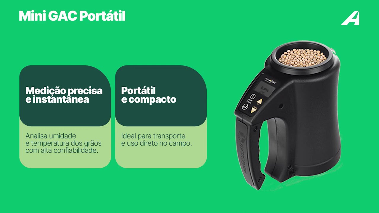 O Mini GAC Portátil é um determinador de umidade dos grãos, ideal para o uso no campo. Fácil de manusear, com bateria portátil e fácil configuração. A qualidade na colheita começa com a umidade ideal dos grãos. Use o GAC Portátil e tome decisões assertivas.